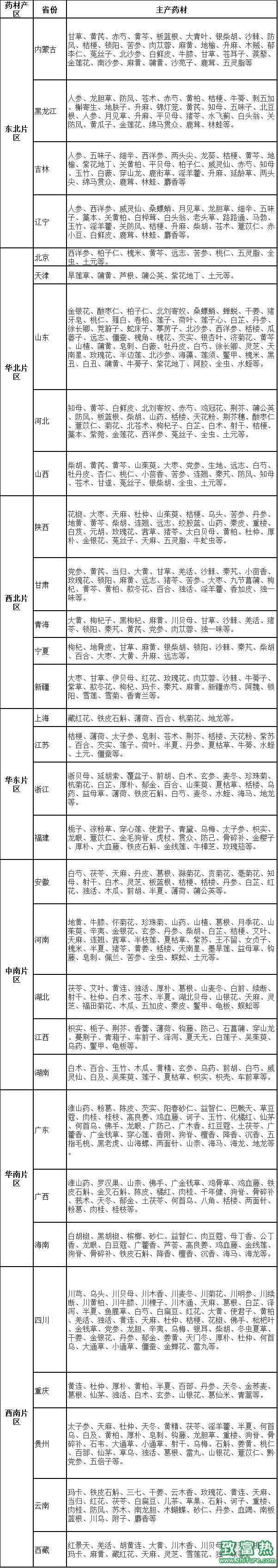 表1:当前国内常用药材产区分布表